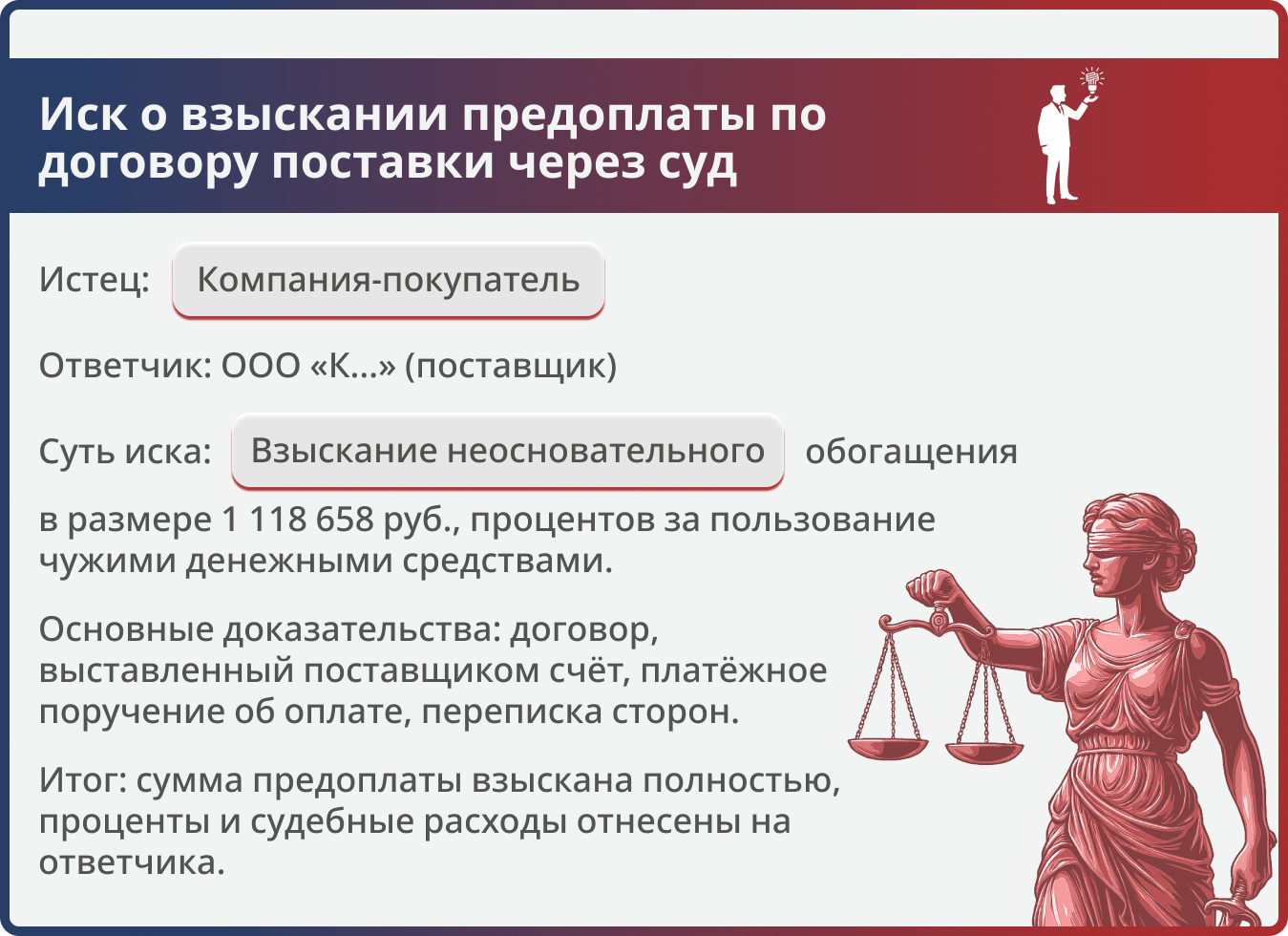 Клиент подписал договор поставки с ООО «К...» и перечислил аванс в размере 1 118 658 руб. Поставщик товар не отгрузил, деньги не вернул. На требование клиента ответил, что договор не заключён (в тексте договора не согласованы наименование и количество товара), поэтому оснований для возврата предоплаты нет. Требовалось взыскать уплаченную сумму и проценты за пользование чужими денежными средствами.