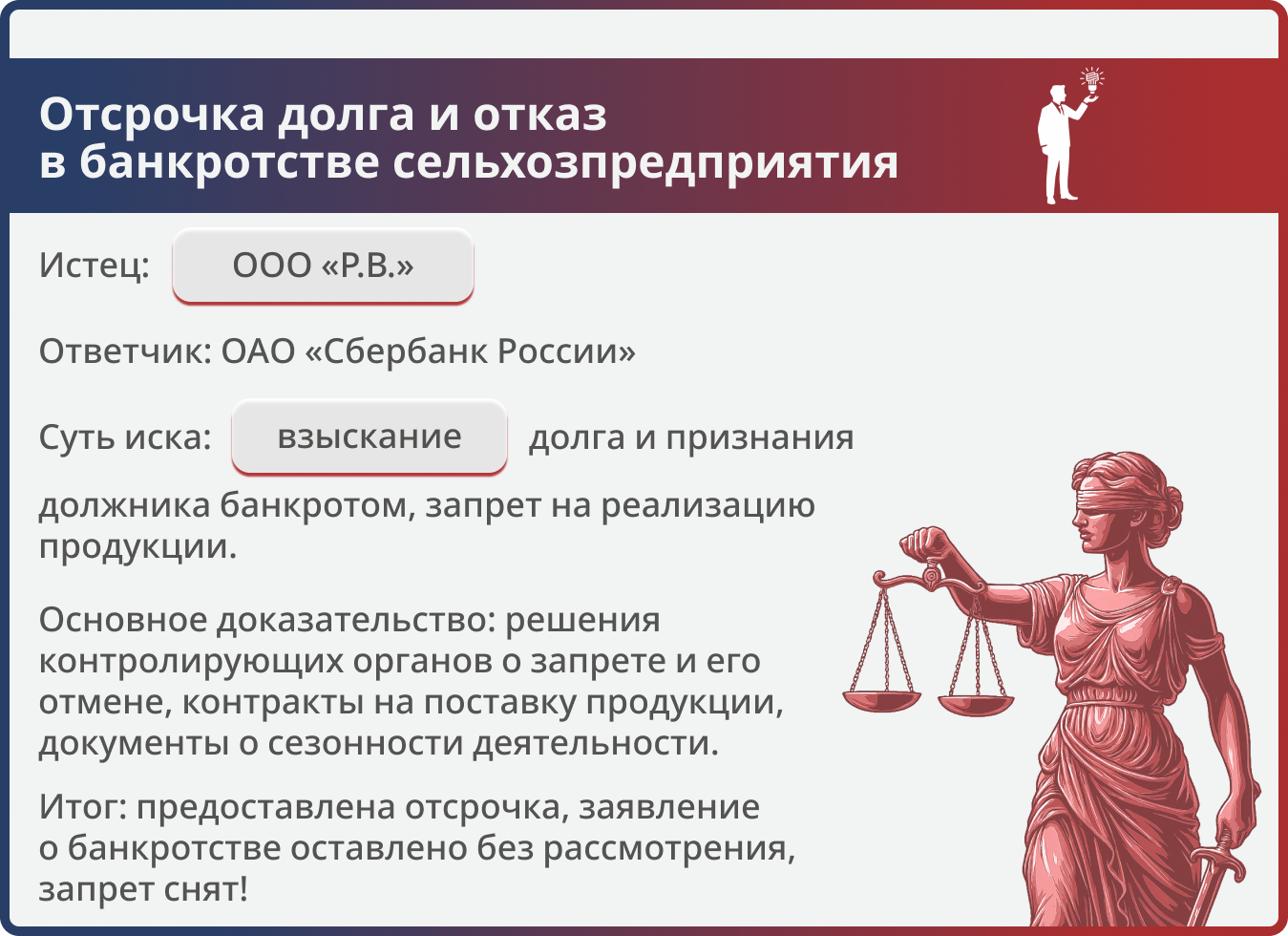 Дело показывает эффективность комплексной защиты бизнеса, оказавшегося под давлением одновременно нескольких факторов: административных ограничений, требований крупного банка и угрозы банкротства. Успех достигнут за счёт грамотного использования процессуальных механизмов (отсрочка исполнения, оставление заявления без рассмотрения) и активного взаимодействия с органами власти. Кейс также подтверждает, что даже при наличии значительной задолженности можно сохранить предприятие, если доказать временный характер трудностей и наличие реального плана восстановления.