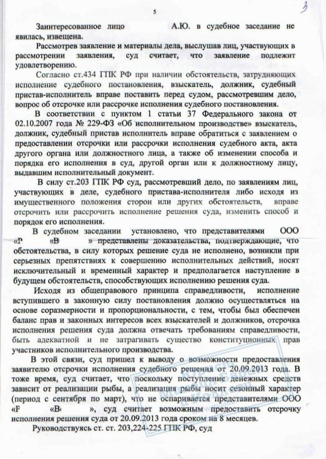 • Отсрочка исполнения решения. В суде общей юрисдикции мы доказали, что неисполнение судебного акта вызвано объективными и временными препятствиями: запрет госветнадзора на продажу рыбы носил сезонный характер и к моменту рассмотрения вопроса был отменён. Предприятие представило контракты на реализацию продукции, что подтверждало возможность погасить долг после возобновления деятельности. Суд признал эти обстоятельства исключительными и предоставил отсрочку, руководствуясь ст. 203 ГПК РФ и ст. 37 Федерального закона «Об исполнительном производстве».