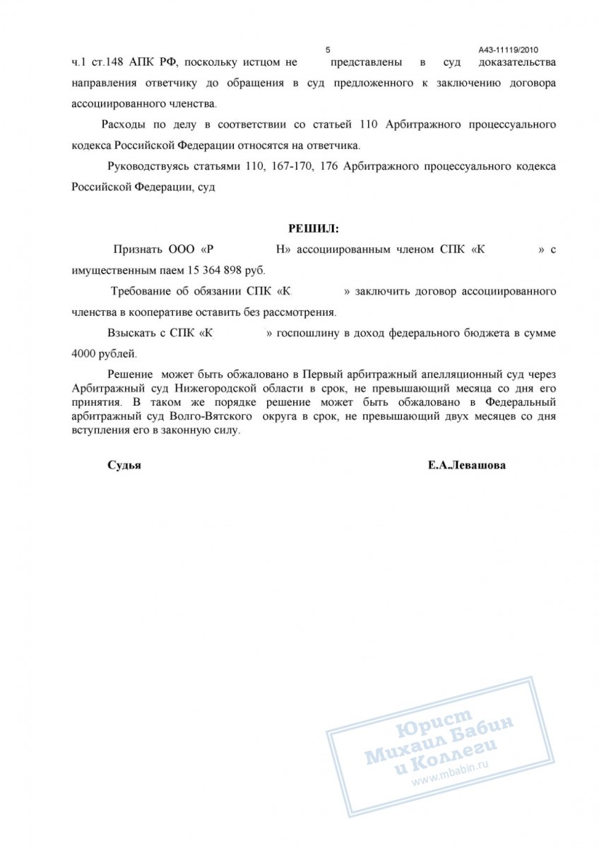Кооператив «К» не признавал ООО «Р-Н» пайщиком, ссылаясь на уставные ограничения и отсутствие решения общего собрания. Мы подготовили и направили в суд иск о признании ООО «Р-Н» ассоциированным членом кооператива с правом на получение дивидендов от стоимости пая. В ходе судебного разбирательства были представлены доказательства приобретения пая, правопреемства в связи с ликвидацией первоначального пайщика и отсутствие устава кооператива, препятствующего такому переходу.