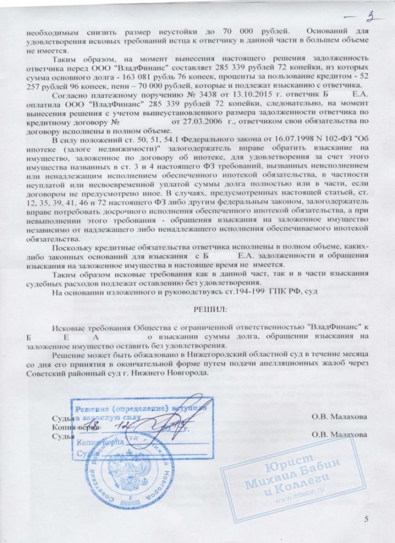 Опытный юрист компании убедил суд в необходимости снизить несоразмерно высокую неустойку в 5 раз. Сумма долга Б.Е. в результате составила 285 тыс. руб., которые были им выплачены кредитору. Документ об уплате долга был предоставлен суду, а дело закрыто.