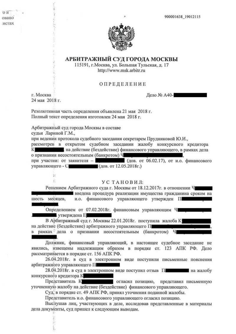 Адвокат разъяснил клиенту, что собрание кредиторов, может быть проведено также и по требованию конкурсного кредитора, чьи требования составляют не менее 10% от суммы всех остальных, включенных в реестр. В дальнейшем адвокат направил финансовому управляющему соответствующее требование, а когда последний уклонился от проведения собрания кредиторов – зафиксировал данное нарушение и обратился с жалобой в Арбитражный суд г. Москвы.