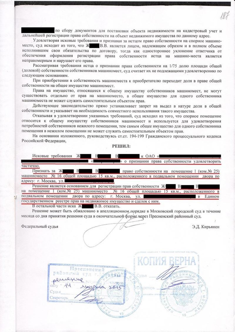 Адвокат ознакомился представленными клиентом материалами и выяснил, что причиной отказов Росреестра в регистрации права явилось недобросовестное действие продавца, который объединил все машиноместа на парковке и поставил их на учет как единый объект в качестве своей собственности. В связи с этим, даже при наличии всех документов, Росреестр отказывал в регистрации права собственности, поскольку машиноместо клиента не было учтено в Государственном кадастре недвижимости в качестве отдельного объекта, а продавец отказывался его выделять. Адвокат Алексей Краснов подготовил исковое заявление и обратился в Пресненский районный суд г. Москвы с требованием о признании за клиентом права собственности.