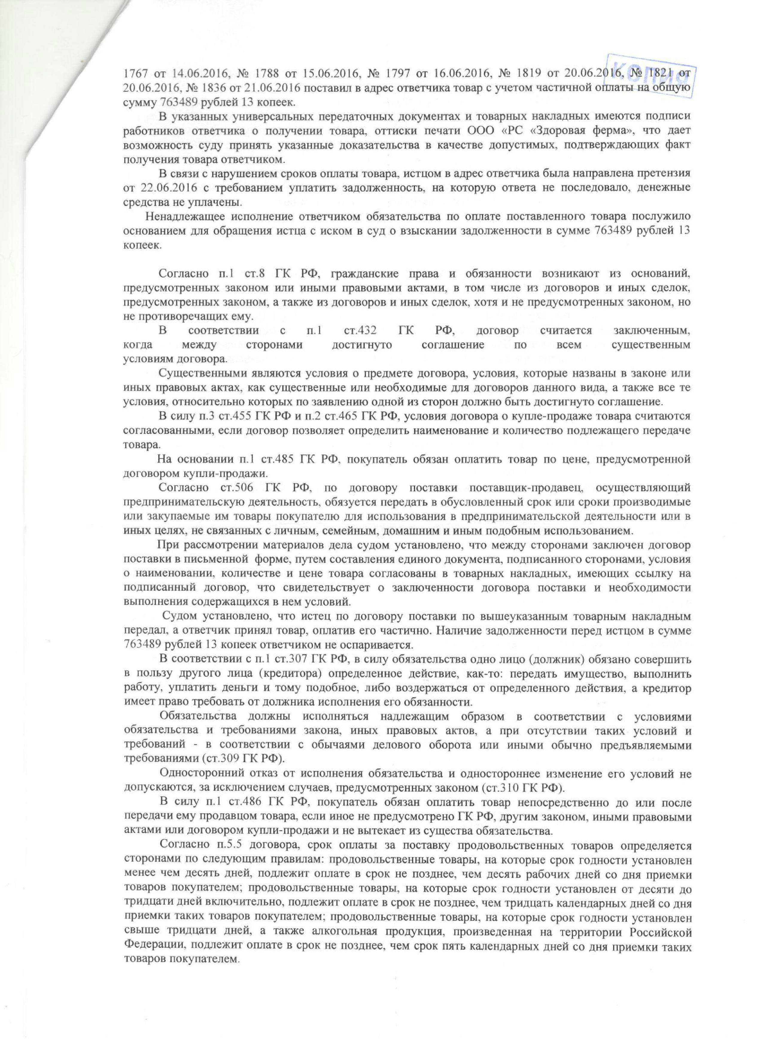 В 2015 году между нашим клиентом — индивидуальным предпринимателем А. — и ООО «Розничная Сеть «Здоровая Ферма» был заключён договор поставки продукции. С мая 2015 по июнь 2016 года клиент исправно поставлял товар, но ответчик оплачивал его не в полном объёме. Образовалась задолженность в размере 763 489 рублей. Клиент обратился к нам. Мы изучили все документы: договор, товарные накладные, счета, акты сверки. Убедившись в обоснованности требований, подготовили исковое заявление и подали его в арбитражный суд вместе с полным пакетом доказательств.