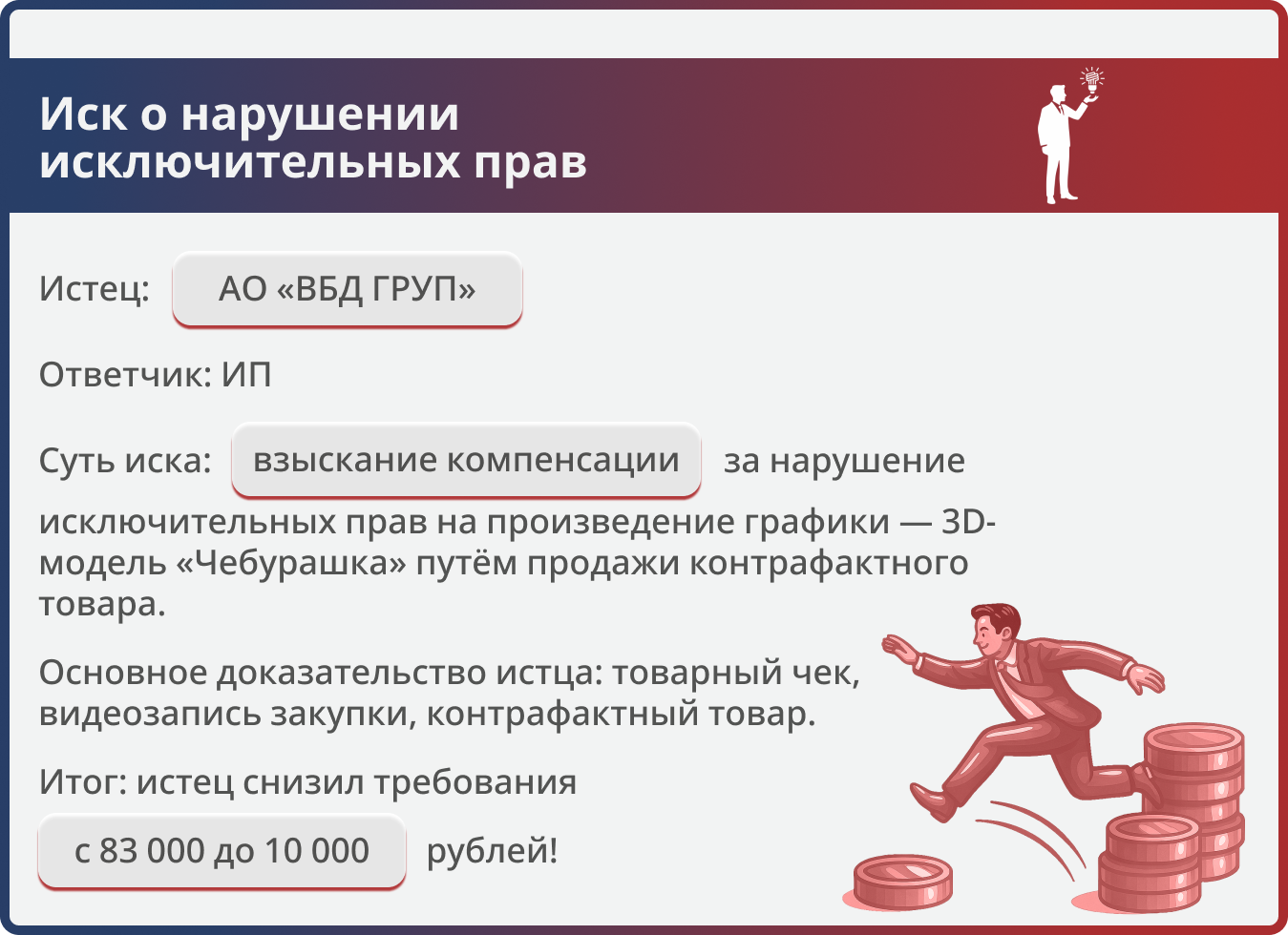 Истец требовал 83 000 руб. за нарушение прав на 3D-модель «Чебурашка». Юристы компании представили контррасчёт, после чего истец добровольно уменьшил иск — итоговая сумма взыскания составила ровно 10 000 руб.