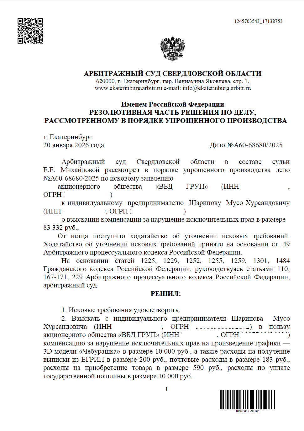Истец (АО «ВБД ГРУП») обратился в суд с иском к ИП о взыскании компенсации за нарушение исключительных прав на произведение графики — 3D-модель «Чебурашка». В иске была заявлена сумма 83 000 руб. Наши юристы представили отзыв с контррасчётом, обосновывающим несоразмерность требований.