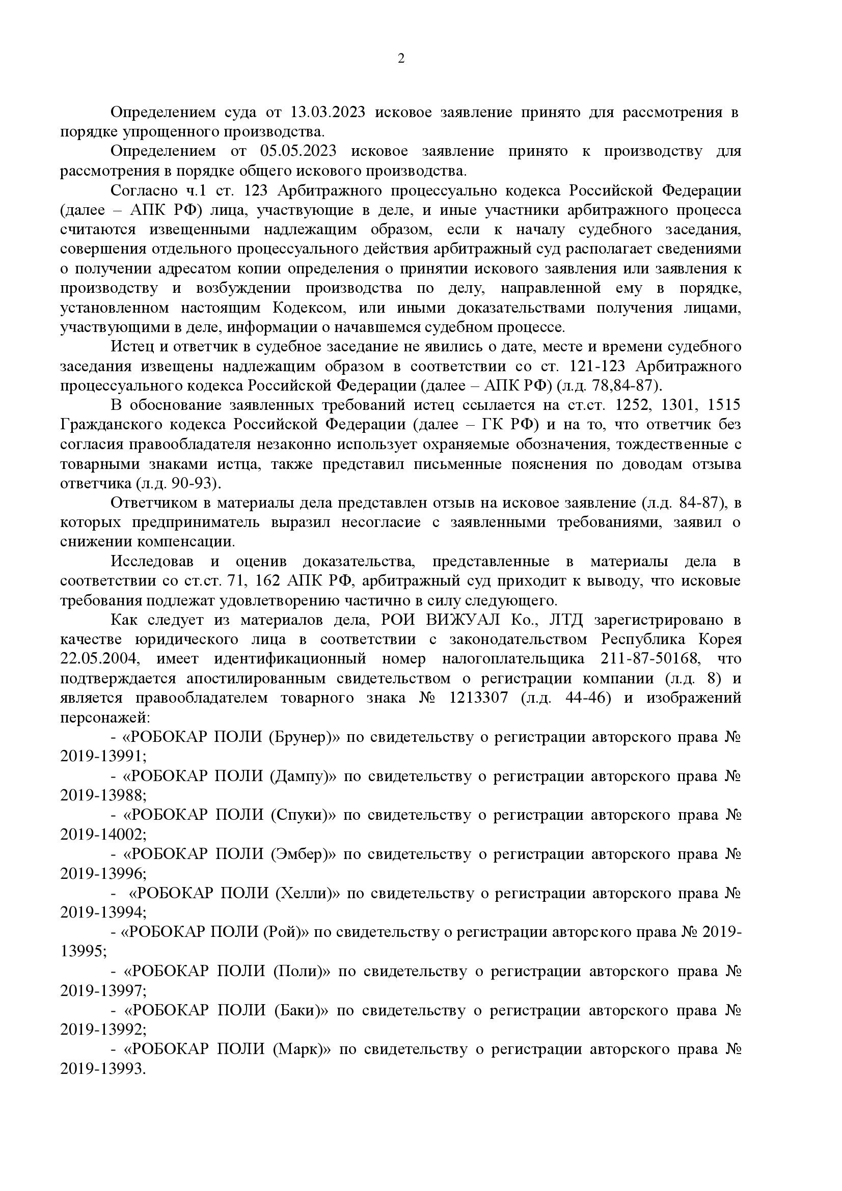 Истец (ROI VISUAL Co., Ltd., Республика Корея) обратился в суд с иском к ИП о взыскании 100 000 руб. компенсации за нарушение исключительных прав на товарный знак и 9 произведений изобразительного искусства — изображения персонажей анимационного сериала «Робокар Поли» (Эммер, Хэлли, Поли, Рой, Марк, Баки, Скул Би, Брунер, Дампу). Основание — продажа в торговой точке ответчика контрафактной игрушки, содержащей указанные обозначения. Ответчик представил отзыв с возражениями и заявил о снижении компенсации. Дело рассмотрено в общем исковом порядке.