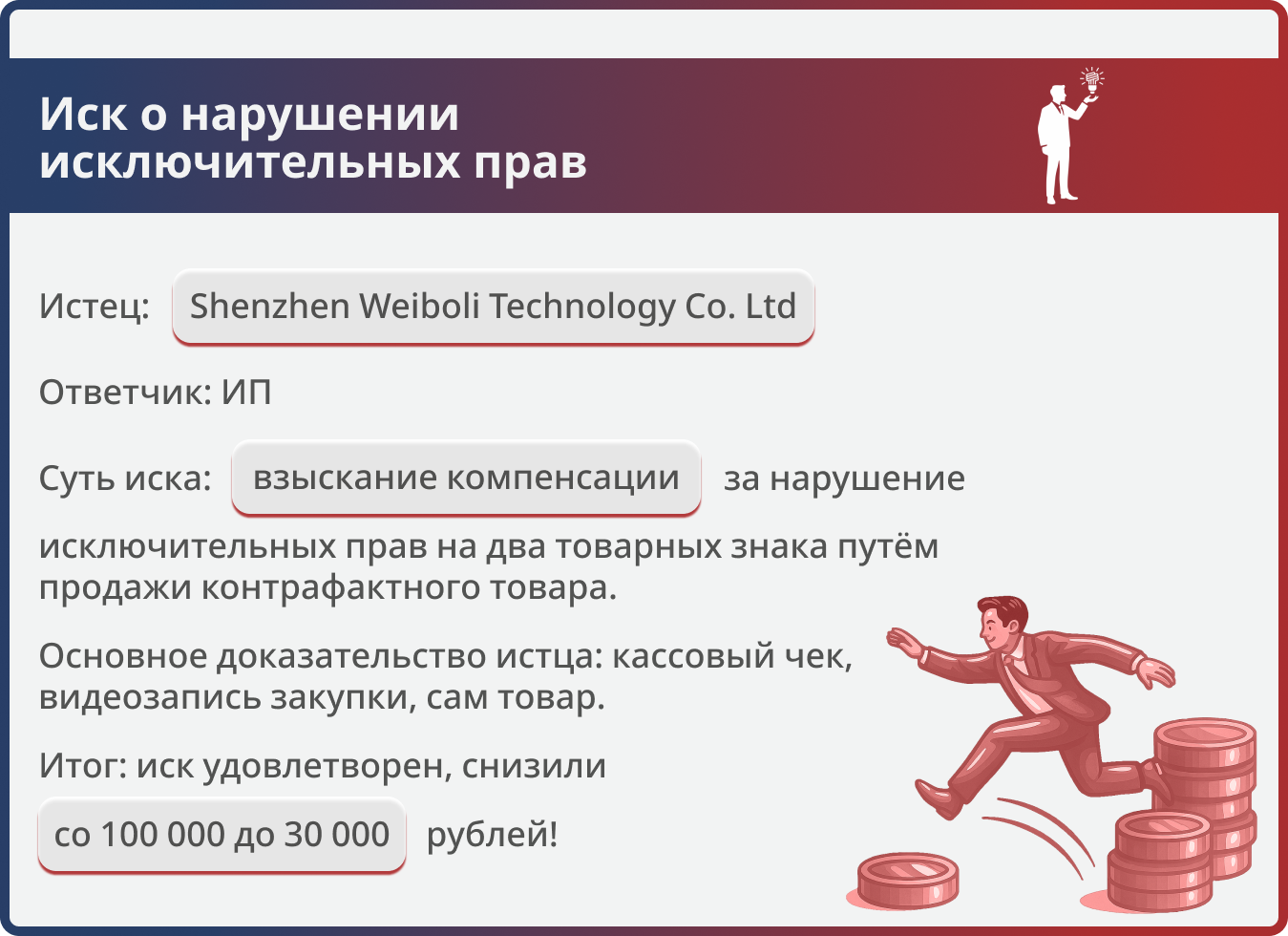 Снижение компенсации китайской компании Shenzhen Weiboli Technology со 100 000 до 30 000 рублей за продажу товара с двумя товарными знаками