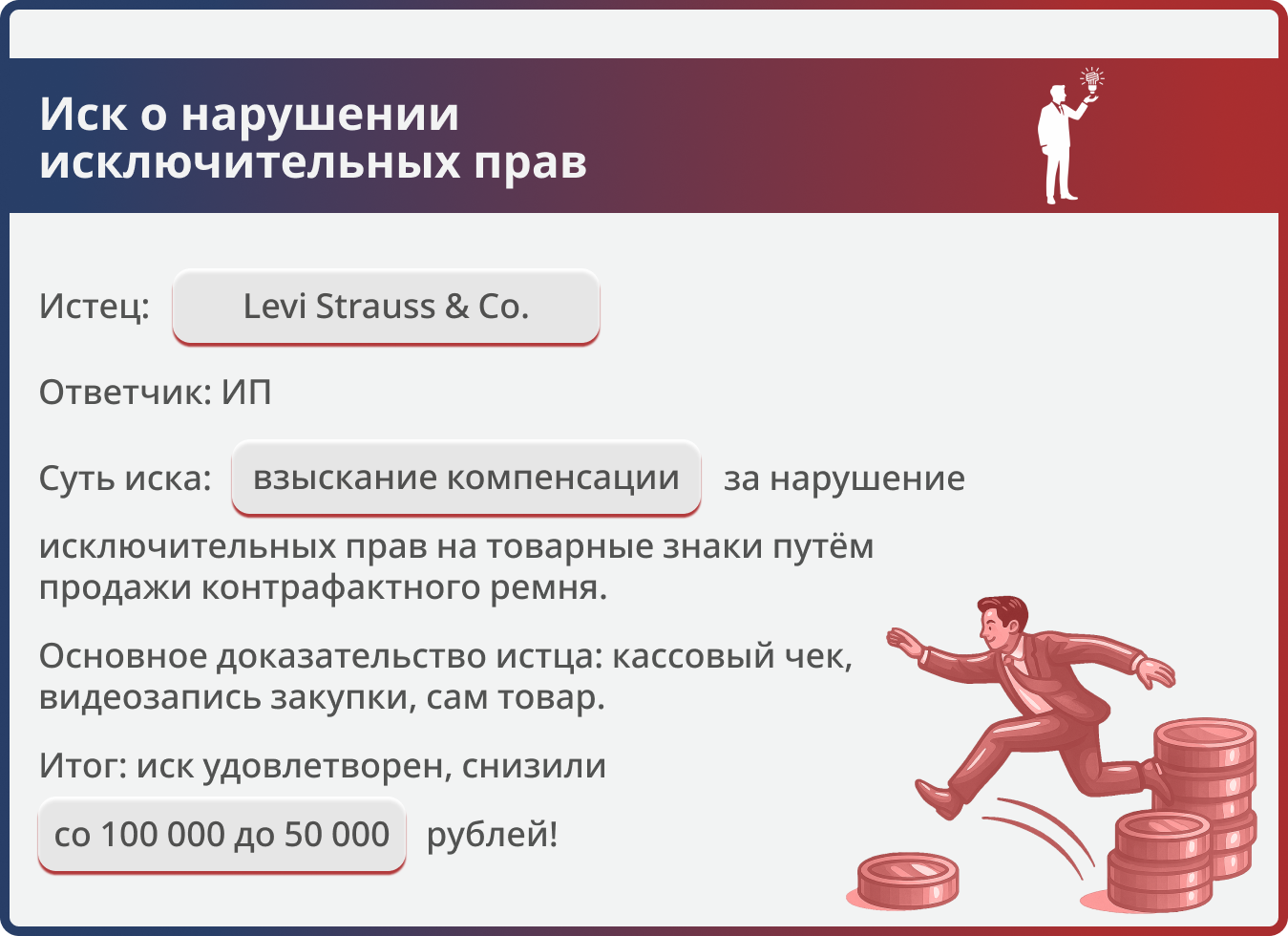 Истец требовал компенсацию за нарушение прав на 4 товарных знака Levi’s. Юристы компании убедили суд, что три знака образуют серию с общим доминирующим элементом, и снизили компенсацию вдвое — до 50 000 руб.