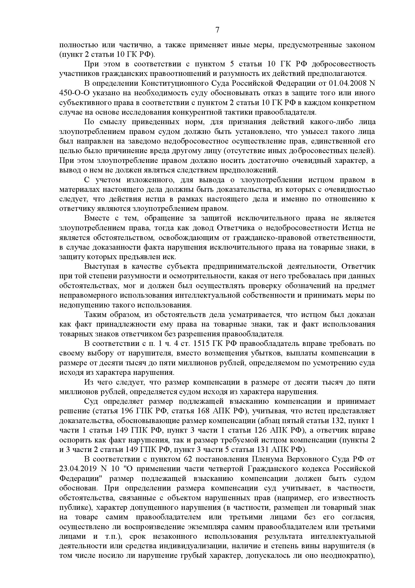 Суд признал факт нарушения, но согласился с доводом о том, что компенсация в размере 100 000 руб. является чрезмерной и не соответствует принципу соразмерности. С учётом характера нарушения, стоимости товара и отсутствия доказательств крупных убытков суд: