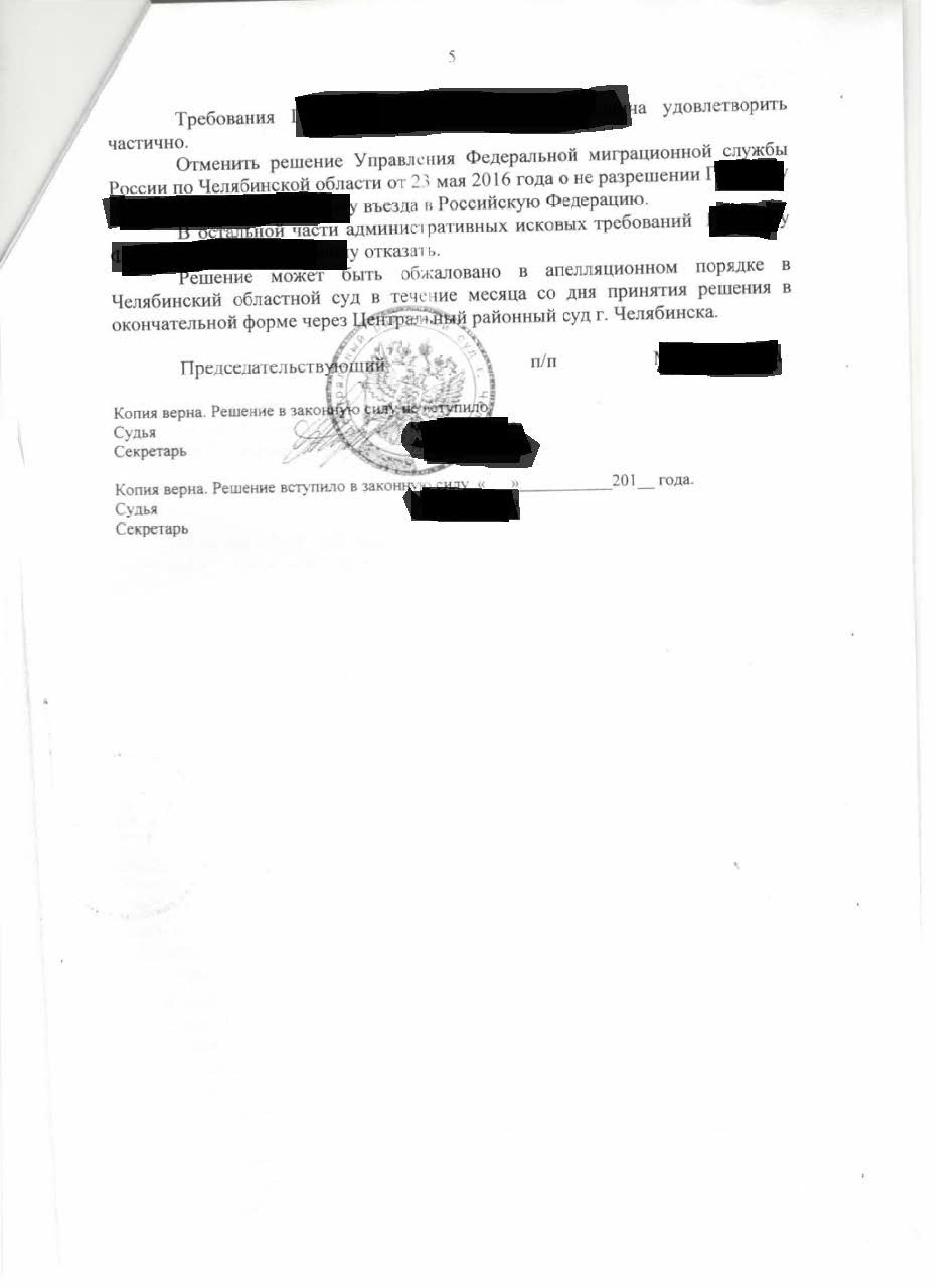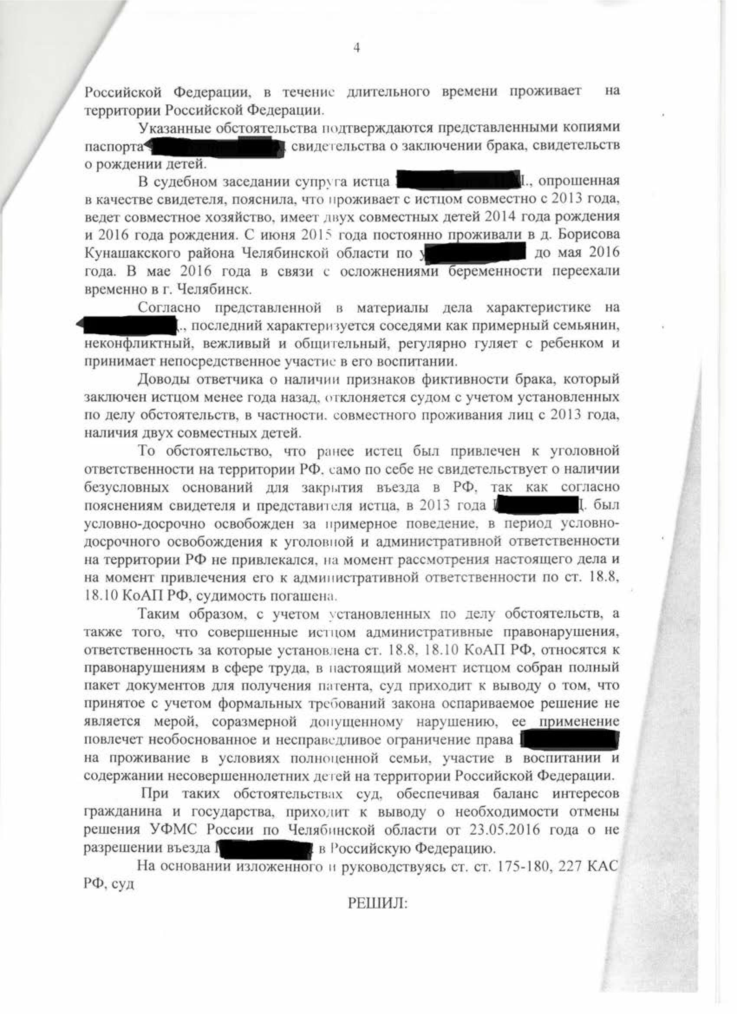 Признание незаконным решения УФМС о неразрешении въезда в РФ