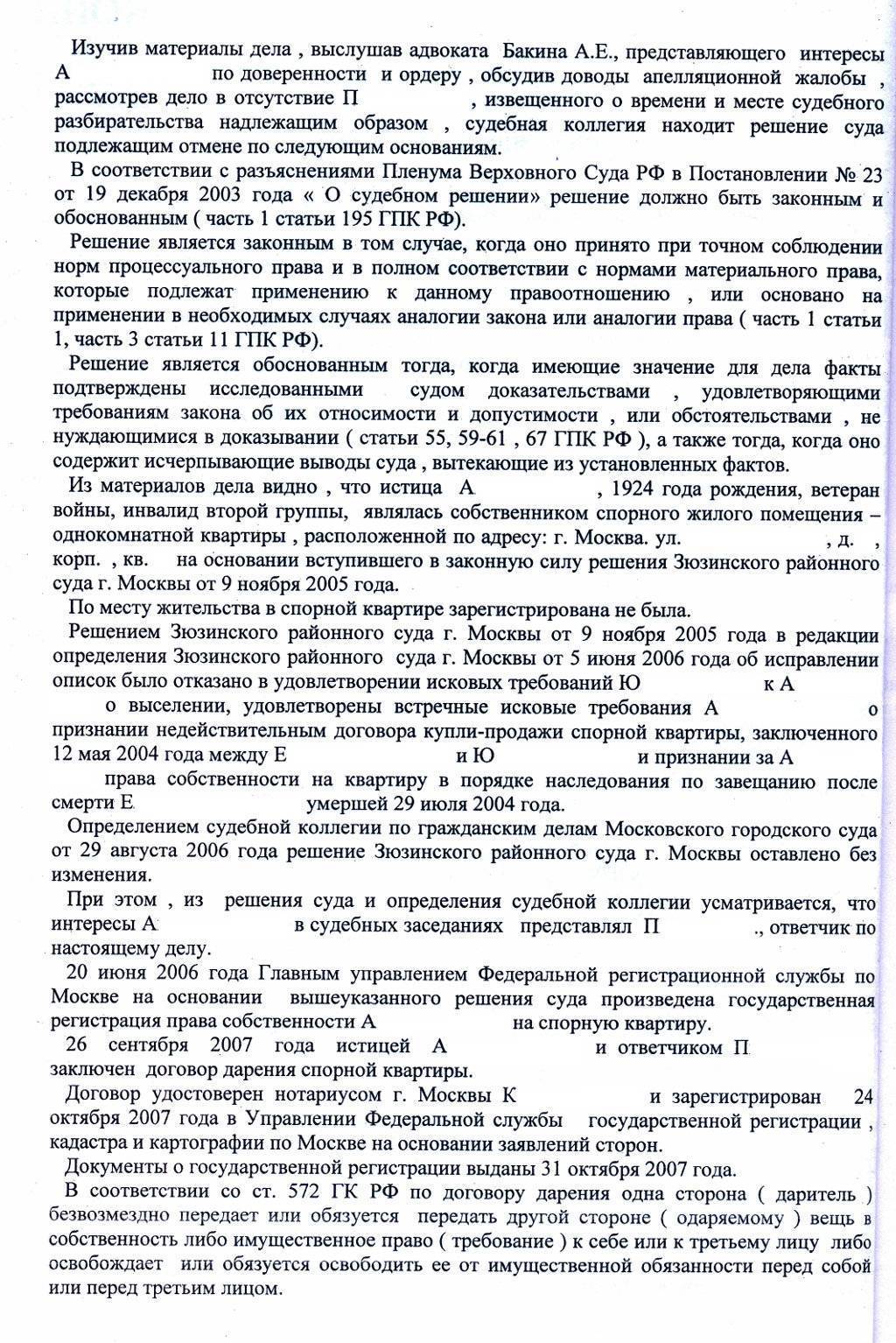 4 октября 2016 в Судебной коллегии по гражданским делам было заслушано дело по апелляционной жалобе на решение районного суда. В инстанцию обратилась истица, 1924 года рождения, с иском о признании недействительным договор дарения однокомнатной квартиры. В принятом судебном решении говорилось об отказе в удовлетворении исковых требований.