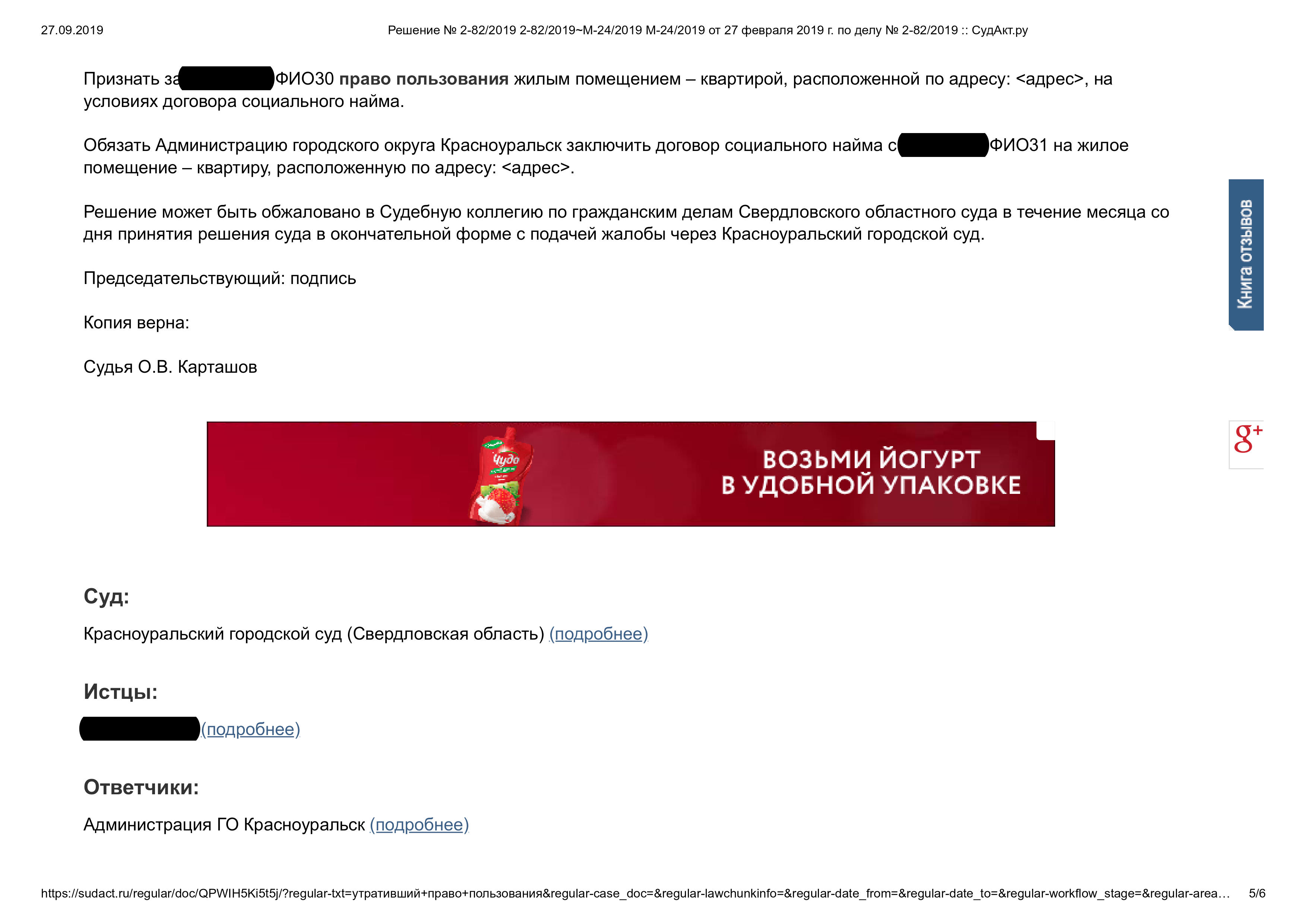 Суд решил: Признать за истцом право пользования жилым помещением – квартирой на условиях договора социального найма. Обязать Администрацию городского округа Красноуральск заключить договор социального найма с истцом на жилое помещение – квартиру.