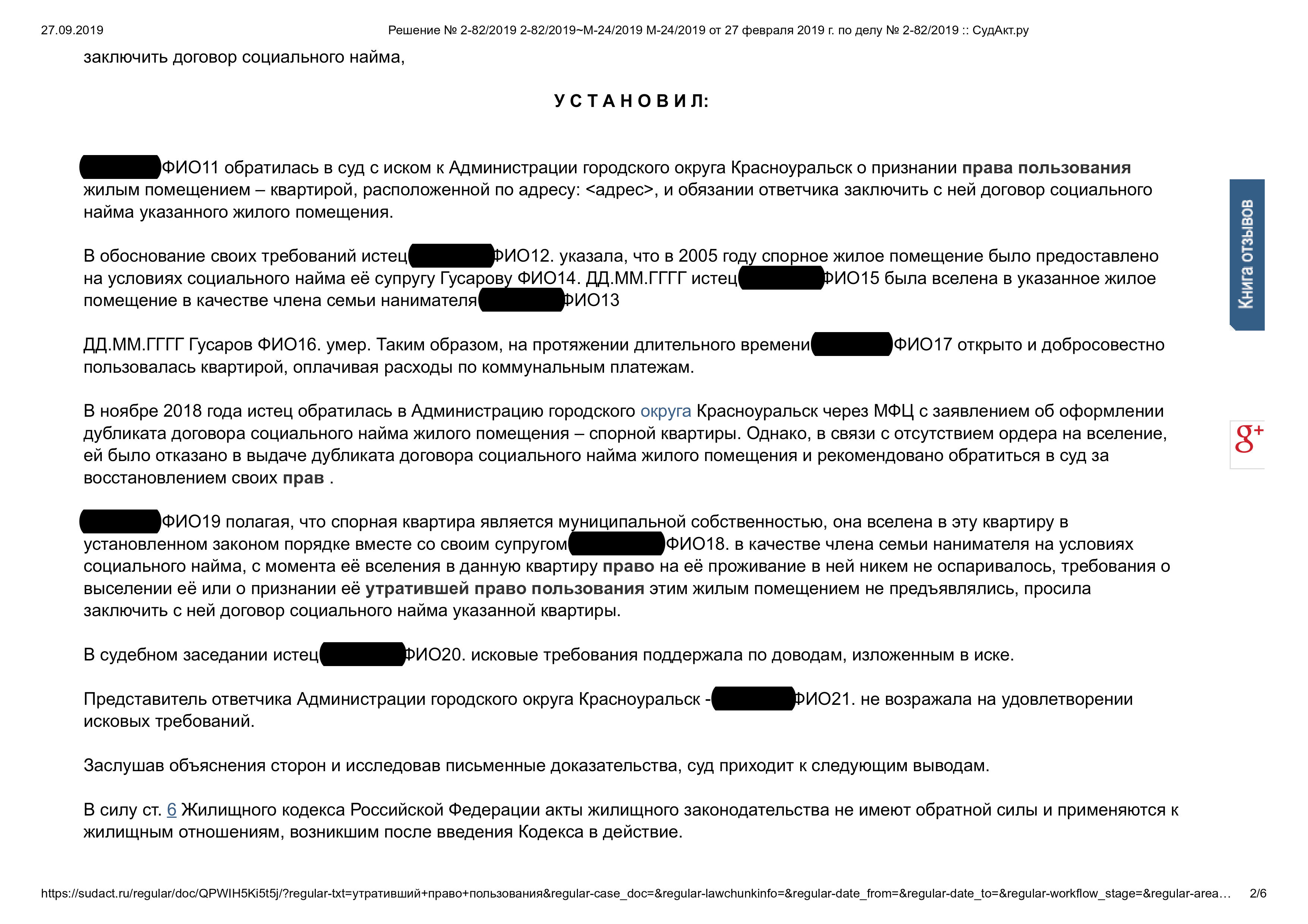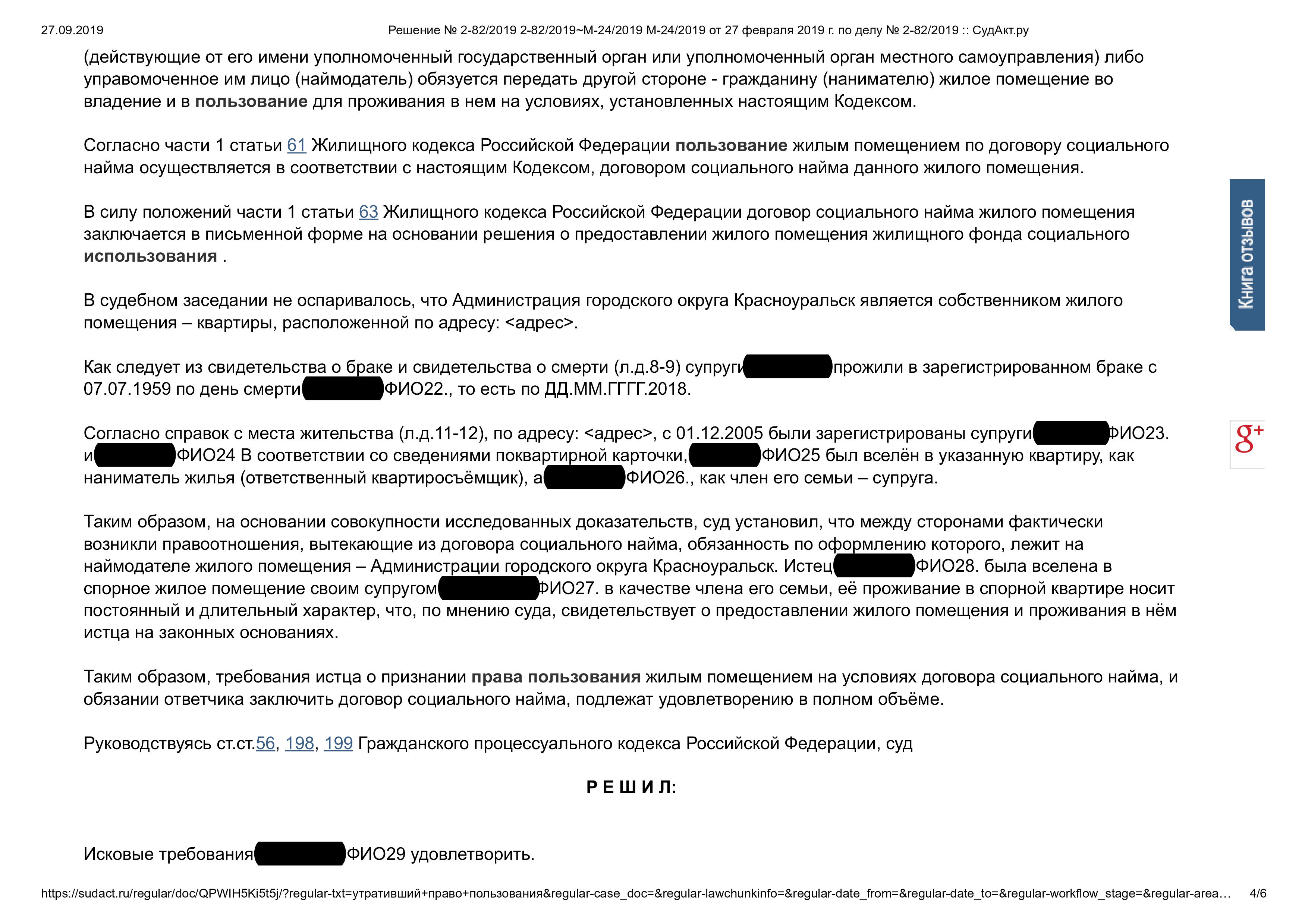 Признание права пользования жилым помещением